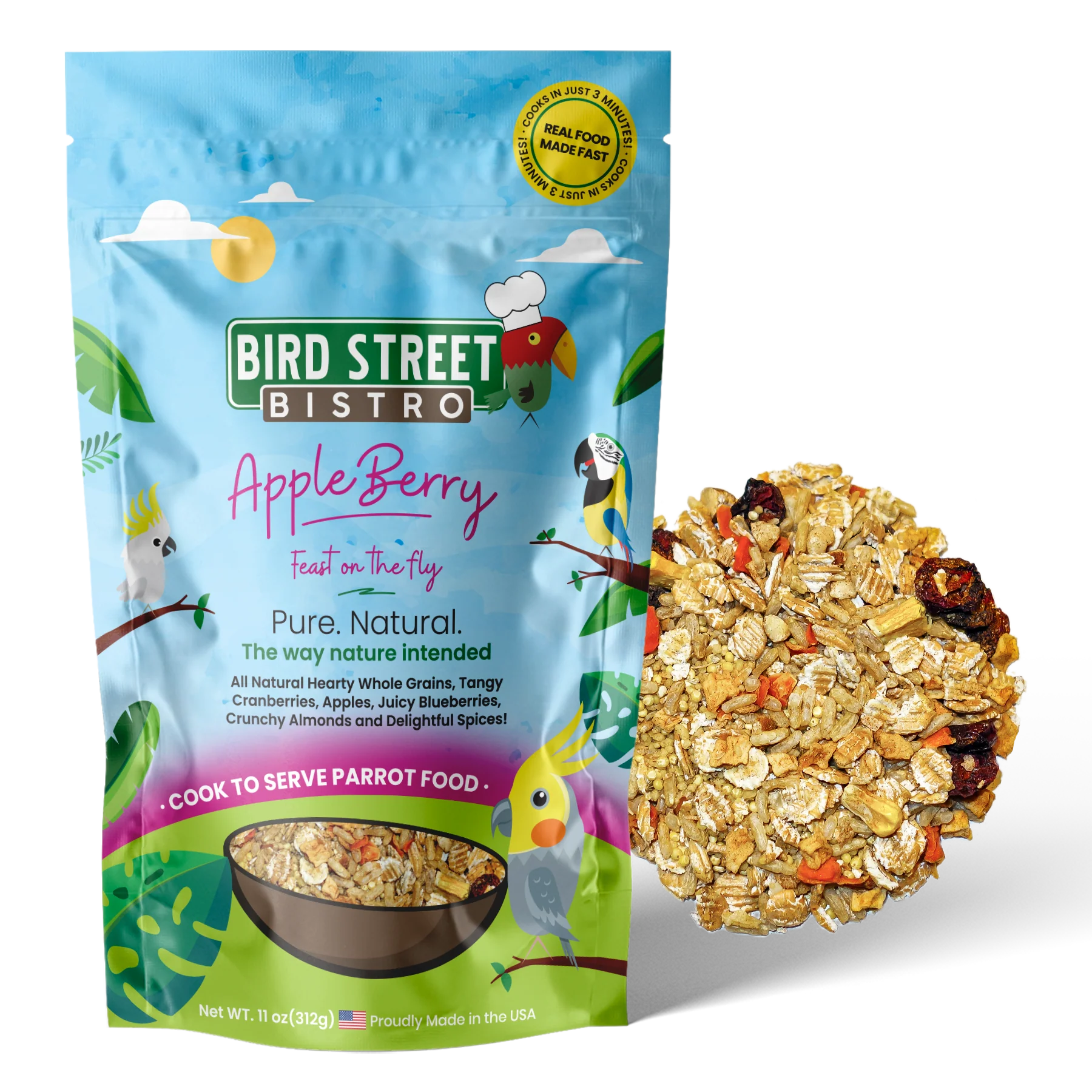Fresh-picked produce is the best healthy food for birds! With Bird Street Bistro, your parrot can enjoy organic ingredients and rich flavors, just like in the wild. Made with a wide mix of wholesome foods and flavors, Bird Street Bistro's AppleBerry also encourages foraging instincts! Every batch contains 100% natural ingredients and no preservatives, fillers, or artificial extras, so you never have to wonder what to feed your parrot. Easily bring the dried blend to life by boiling the dry ingredients in just 3 minutes. Naturally sweet apples, cranberries, blueberries, carrot, and corn are lightly seasoned in ceylon cinnamon, which offers both heart health benefits and delicious flavors parrots love.