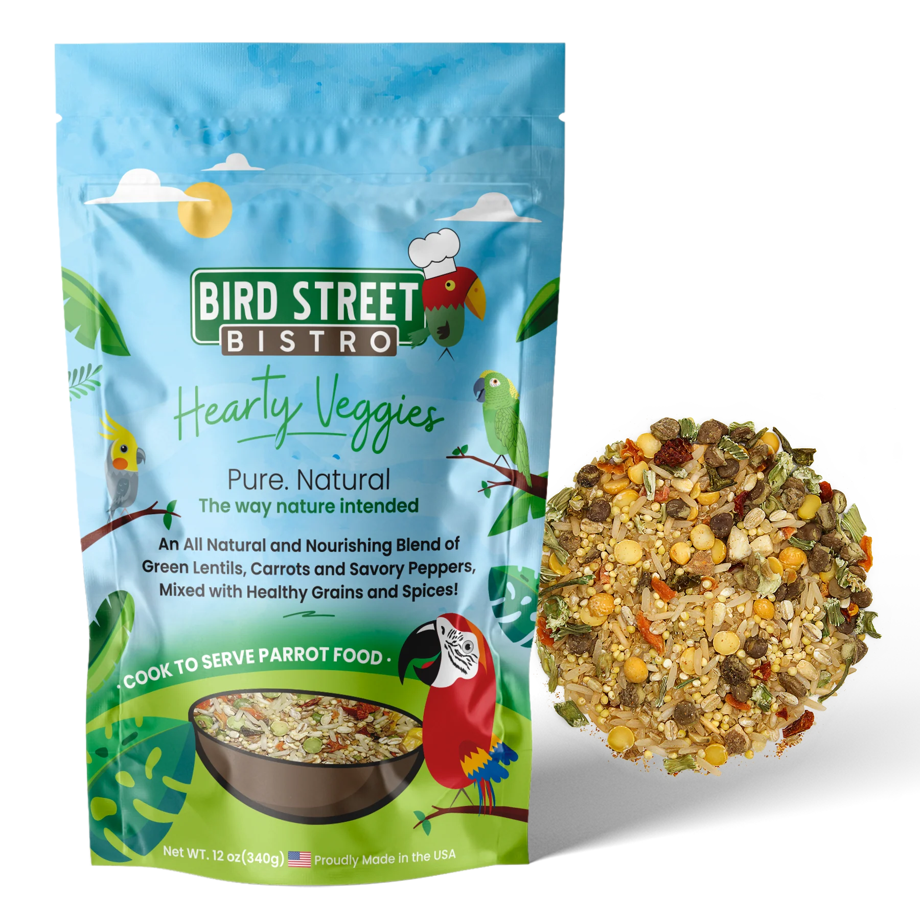Wondering what to feed your parrot? Hearty Veggies Parrot Food. Think of fresh-picked produce, fruits, grains and spices - the best healthy food for parrots! With Bird Street Bistro, your parrot can enjoy a balanced and healthy blend of healthy grains, all natural vegetables and delicious fruits, all seasoned with health oriented spices. Hearty Veggies, similar to all Bird Street Bistro varieties, has a wholesome blend of dried vegetables and nutritious grains seasoned with lively, fresh spices. You never have to worry about artificial flavors, colors, or preservatives! Your bird deserves better than a "bird protein bar" or pellet. Bird Street Bistro blends contain all natural proteins and minerals derived from mother nature. Always, pure and simple, the way nature intended.