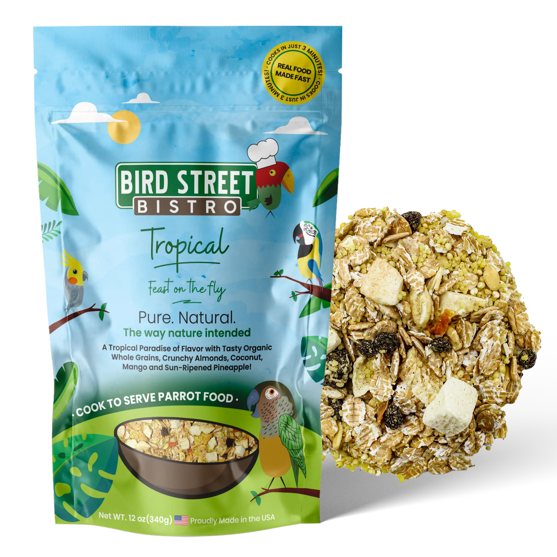 This flavorful parrot food blend will perk up their feathers with the delicious scent of coconut, cinnamon, ginger, mango, and pineapple. rolled kamut grains keep the energy going with a natural boost of vitamin E and complete proteins. If your parrot lacks vigor or suffers from age-related degeneration, tropical parrot food will support their health with a mealtime trip to the tropics. The dried blend cooks quickly with a wide variety of textures and flavors that your bird will love foraging for. Tropical Feast on the Fly includes soft dried fruit, crunchy almonds, spicy-sweet anise seeds, and eight different grains. Like all Bird Street Bistro blends, this healthy food for birds is proudly made without fillers, additives, sugar, salt, or artificial ingredients.