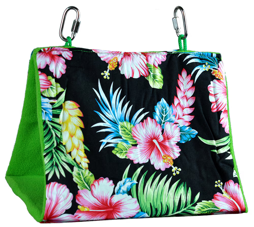 This tent-like bird bed keeps larger-sized birds warm and sheltered inside the cage. They'll love hiding out inside because it's lined with soft sherpa. Two open ends ease access and create a fun tunnel in which your bird can also play. Outer fabric is made of tough poly/cotton twill. Easy care - just toss in the machine to wash.